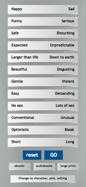 The site is British, and once you’ve found a book that interests you, there are links to borrow from a library or buy through Amazon. If you’re not in the UK, there’s a link to WorldCat, so you can find a copy of the book in a library near you. I’ve played with the variables a lot, and the results are promising: a few books that I’ve already read and enjoyed came up, as well as a number of titles I hadn’t heard of before but that looked good. Try it out!
